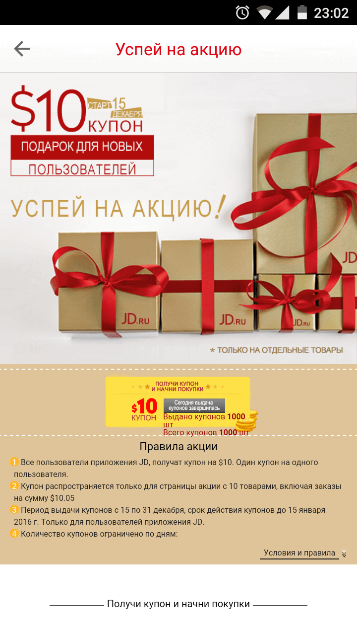 Интернет магазин jd.ru продолжает свои попытки завоевать рынок России и снова приготовил для вас отличный подарок — купон на $10 от $10.05 за регистрацию в мобильном приложении. Получить купон могут как старые, так и новые пользователи